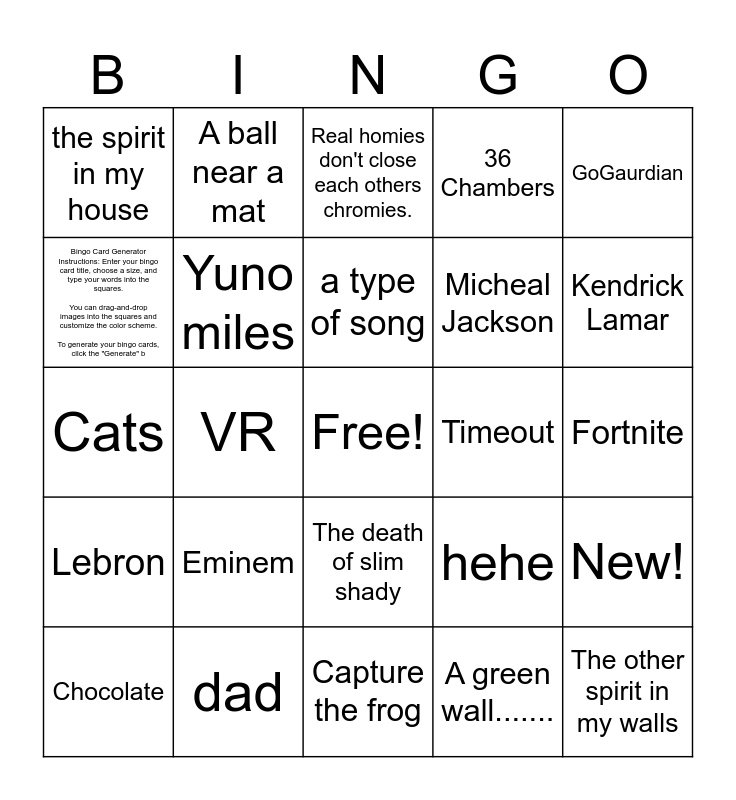 This bingo card has a free space and 24 words: Eminem, dad, a type of song, Chocolate, GoGaurdian, the spirit in my house, Bingo Card Generator Instructions: Enter your bingo card title, choose a size, and type your words into the squares. You can drag-and-drop images into the squares and customize the color scheme. To generate your bingo cards, cilck the "Generate" b, A ball near a mat, Timeout, The death of slim shady, Micheal Jackson, Cats, hehe, New!, Yuno miles, A green wall......., Fortnite, Real homies don't close each others chromies., Kendrick Lamar, VR, The other spirit in my walls, Lebron, 36 Chambers and Capture the frog.