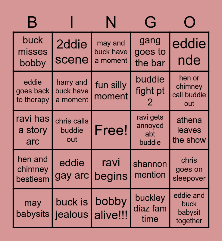This bingo card has a free space and 24 words: may babysits, eddie gay arc, fun silly moment, buckley diaz fam time, eddie nde, buck misses bobby, 2ddie scene, may and buck have a moment, ravi gets annoyed abt buddie, athena leaves the show, ravi has a story arc, harry and buck have a moment, shannon mention, chris goes on sleepover, eddie goes back to therapy, buck is jealous, bobby alive!!!, gang goes to the bar, hen or chimney call buddie out, hen and chimney bestiesm, chris calls buddie out, ravi begins, buddie fight pt 2 and eddie and buck babysit together.