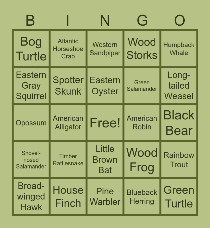 This bingo card has a free space and 68 words: Glass Lizard, Green Turtle, Mud Fiddler Crab, Red-jointed Fiddler Crab, Marsh Grass Shrimp, Atlantic Blue Crab, Atlantic Horseshoe Crab, Cannonball Jellyfish, Eastern Oyster, Crested Oyster, Little Brown Bat, Bottlenose Dolphin, Black Bear, Humpback Whale, Swamp Rabbit, Eastern Gray Squirrel, American Alligator, Bog Turtle, Snapping Turtle, Timber Rattlesnake, Green Salamander, Wood Frog, Shovel-nosed Salamander, Eastern Milk Snake, Coal Skink, Black-belied Salamader, Loggerhead Sea Turtle, Spotted Sunfish, Rainbow Trout, Brook Trout, Western Sandpiper, Black-bellied Plover, Barn Owl, Bald Eagle, Wood Storks, Great Blue Heron, Wood Stork, Broad-winged Hawk, Long-tailed Weasel, Opossum, Raccoon, River Otter, Spotter Skunk, Pine Siskin, White-breasted Nuthatch, Brown Thrasher, Sparrow, Brown-headed Cowbird, American Robin, House Finch, Northern Mockingbird, Eastern Bluebird, Red-bellied Woodpecker, Pine Warbler, American Crow, Atlantic Sturgeon, Blueback Herring, Green Sunfish, Carolina Wren, Northern Cardinal, Blue jay, White-tailed Deer, Bobcat, Geese, Striped Bass, Crawfish, Blue catfish and Mourning Dove.