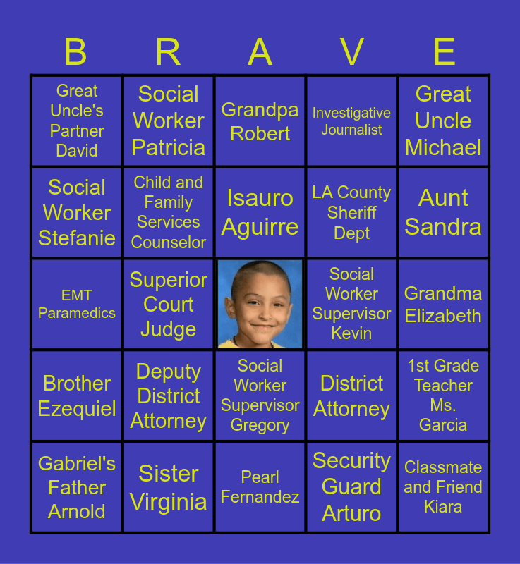 This bingo card has a free space and 25 words: Deputy District Attorney, Pearl Fernandez, Isauro Aguirre, Gabriel's Father Arnold, Great Uncle Michael, Great Uncle's Partner David, Social Worker Stefanie, Social Worker Patricia, Social Worker Supervisor Kevin, Social Worker Supervisor Gregory, LA County Sheriff Dept, EMT Paramedics, District Attorney, 1st Grade Teacher Ms. Garcia, Child and Family Services Counselor, Palmdale Community, Grandma Elizabeth, Grandpa Robert, Aunt Sandra, Superior Court Judge, Classmate and Friend Kiara, Sister Virginia, Brother Ezequiel, Investigative Journalist and Security Guard Arturo.