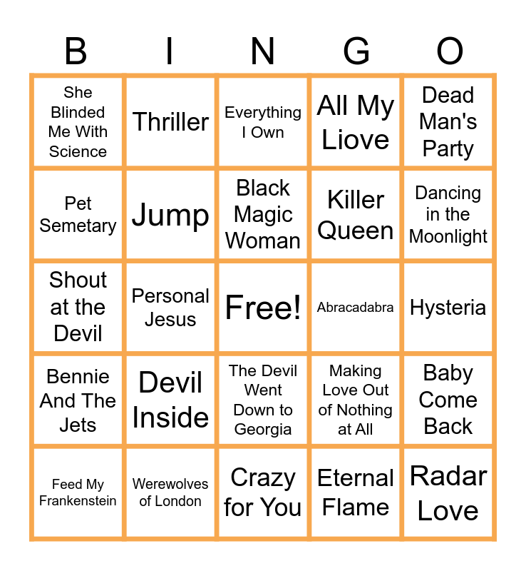 This bingo card has a free space and 24 words: Devil Inside, Werewolves of London, Black Magic Woman, Feed My Frankenstein, Dead Man's Party, She Blinded Me With Science, Pet Semetary, Thriller, Abracadabra, The Devil Went Down to Georgia, Killer Queen, Shout at the Devil, Making Love Out of Nothing at All, Baby Come Back, Jump, Eternal Flame, Hysteria, Everything I Own, Dancing in the Moonlight, Personal Jesus, Radar Love, Bennie And The Jets, All My Liove and Crazy for You.