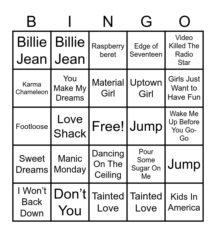⚠ This card has duplicate items: Take on Me (2), Billie Jean (2), Every Breath You Take (2), Africa (2), Girls Just Want to Have Fun (2), Karma Chameleon (2), Sweet Dreams (2), Wake Me Up Before You Go-Go (2), Livin’ On A Prayer (2), Celebration (2), Smooth Criminal (2), Tarzan Boy (2), Walking On Sunshine (2), What A Feeling (2), We Built This City (2), Jump (4), Tainted Love (2), Video Killed The Radio Star (2), Don’t Stop Believin’ (2), Never Gonna Give You Up (2), Material Girl (2), Uptown Girl (2), Don’t You (2), Total Eclipse of the Heart (2), We’re Not Gonna Take It (2), One Way or Another (2), Kids In America (2), Dancing In the Dark (2), Dancing On The Ceiling (2), I Wanna Dance with Somebody (2), Footloose (2), Love Shack (2), Jessie’s Girl (2), Raspberry beret (2), You Make My Dreams (2), Everywhere (2), Edge of Seventeen (2), If I could Turn Back Time (2), You Can Call Me Al (2), Summer of ‘69 (2), Hurts So Good (2), I Think We’re Alone Now (2), We Didn’t Start the Fire (2), Crazy Little Thing Called Love (2), Super Trouper (2), Hungry Like the Wolf (2), Manic Monday (2), I’m Still Standing (2), Pour Some Sugar On Me (2), The Best (2), I Won’t Back Down (2), Gloria (2), Higher Love (2), Hungry Eyes (2), Straight Up (2), You Shook Me All Night Long (2), It’s Raining Men (2), The Power of Love (2), We Belong (2), Don’t You Want Me (2), I Can Dream About You (2), Physical (2), I Still Haven’t Found What I’m Looking For (2)