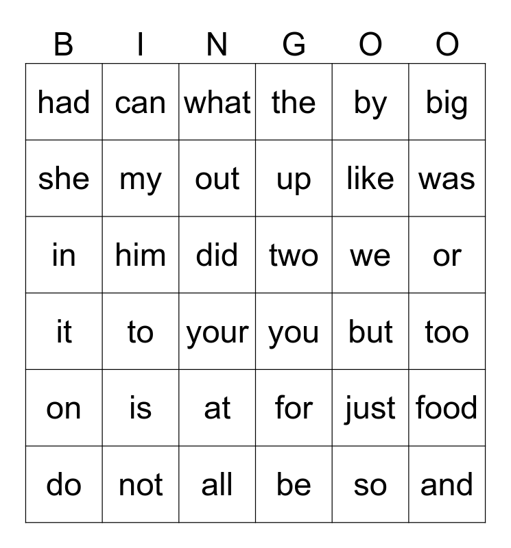 This bingo card has 36 words: for, at, be, she, it, two, my, all, by, just, was, the, food, him, up, had, on, we, in, what, did, to, you, your, but, can, like, not, out, big, and, do, too, or, is and so.