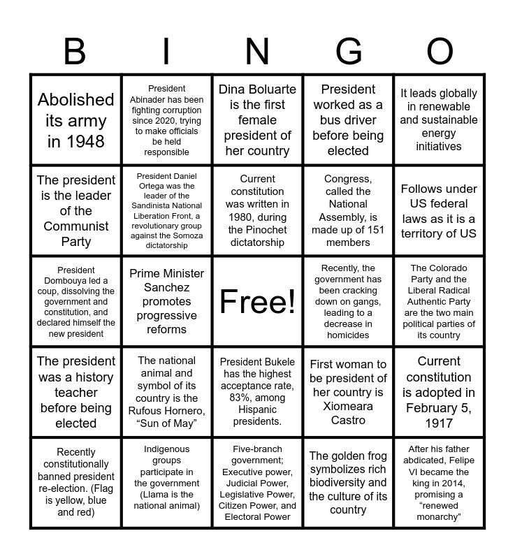 This bingo card has a free space and 24 words: The national animal and symbol of its country is the Rufous Hornero, “Sun of May”, Indigenous groups participate in the government (Llama is the national animal), Current constitution was written in 1980, during the Pinochet dictatorship, Recently constitutionally banned president re-election. (Flag is yellow, blue and red), It leads globally in renewable and sustainable energy initiatives, Abolished its army in 1948, The president is the leader of the Communist Party, President Abinader has been fighting corruption since 2020, trying to make officials be held responsible, Recently, the government has been cracking down on gangs, leading to a decrease in homicides, President Bukele has the highest acceptance rate, 83%, among Hispanic presidents., Congress, called the National Assembly, is made up of 151 members, President Dombouya led a coup, dissolving the government and constitution, and declared himself the new president, First woman to be president of her country is Xiomeara Castro, Current constitution is adopted in February 5, 1917, President Daniel Ortega was the leader of the Sandinista National Liberation Front, a revolutionary group against the Somoza dictatorship, The golden frog symbolizes rich biodiversity and the culture of its country, The Colorado Party and the Liberal Radical Authentic Party are the two main political parties of its country, Dina Boluarte is the first female president of her country, Follows under US federal laws as it is a territory of US, Prime Minister Sanchez promotes progressive reforms, After his father abdicated, Felipe VI became the king in 2014, promising a “renewed monarchy”, The president was a history teacher before being elected, President worked as a bus driver before being elected and Five-branch government; Executive power, Judicial Power, Legislative Power, Citizen Power, and Electoral Power.