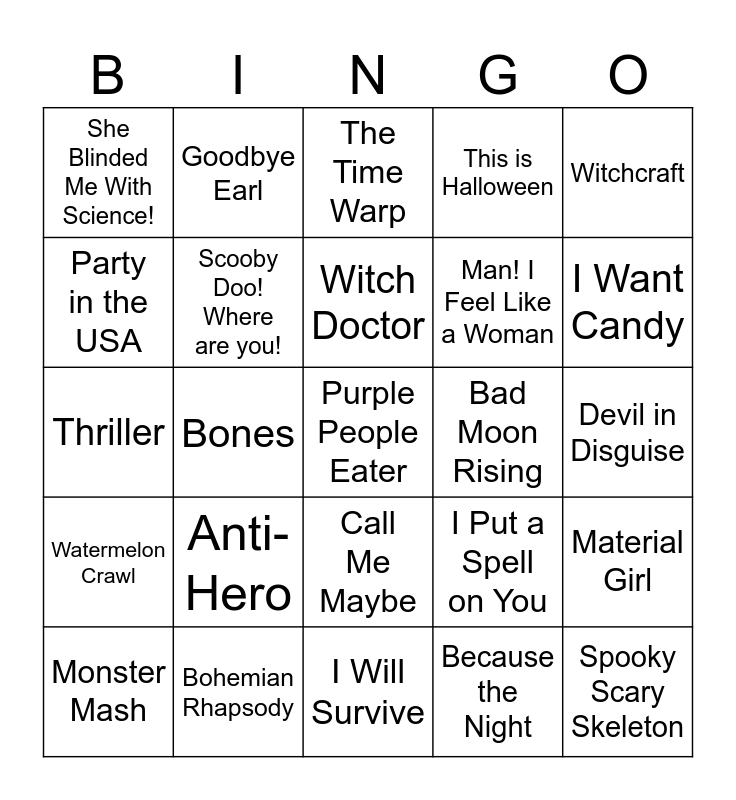 This bingo card has a free space and 29 words: Monster Mash, It's Tricky, Bones, Fishing in the Dark, She Blinded Me With Science!, The Time Warp, Scooby Doo! Where are you!, Anti-Hero, Bad Moon Rising, Bohemian Rhapsody, Devil in Disguise, Spooky Scary Skeleton, I Will Survive, Because the Night, I Want Candy, Ghost Busters, Call Me Maybe, Watermelon Crawl, Witchcraft, Thriller, I Put a Spell on You, Dreams, Man! I Feel Like a Woman, Party in the USA, This is Halloween, Goodbye Earl, Material Girl, Witch Doctor and Suspicious Minds.