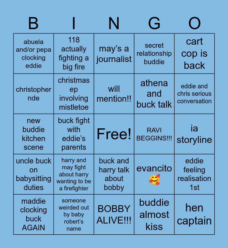 This bingo card has a free space and 24 words: harry and may fight about harry wanting to be a firefighter, someone weirded out by baby robert’s name, will mention!!, maddie clocking buck AGAIN, cart cop is back, abuela and/or pepa clocking eddie, christopher nde, 118 actually fighting a big fire, RAVI BEGGINS!!!, buck and harry talk about bobby, athena and buck talk, new buddie kitchen scene, evancito 🥰, eddie feeling realisation 1st, christmas ep involving mistletoe, buddie almost kiss, ia storyline, may’s a journalist, eddie and chris serious conversation, buck fight with eddie’s parents, hen captain, uncle buck on babysitting duties, secret relationship buddie and BOBBY ALIVE!!!.