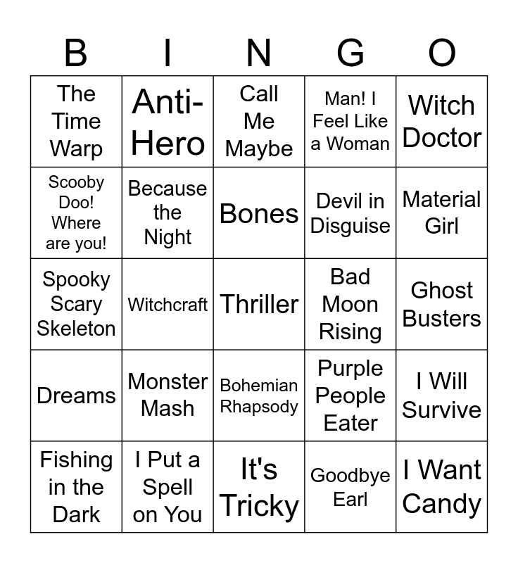 This bingo card has 25 words: Monster Mash, It's Tricky, Bones, Fishing in the Dark, Witch Doctor, The Time Warp, Scooby Doo! Where are you!, Anti-Hero, Bad Moon Rising, Bohemian Rhapsody, Devil in Disguise, Spooky Scary Skeleton, Purple People Eater, I Will Survive, Because the Night, I Want Candy, Ghost Busters, Call Me Maybe, Material Girl, Witchcraft, Thriller, I Put a Spell on You, Dreams, Man! I Feel Like a Woman and Goodbye Earl.