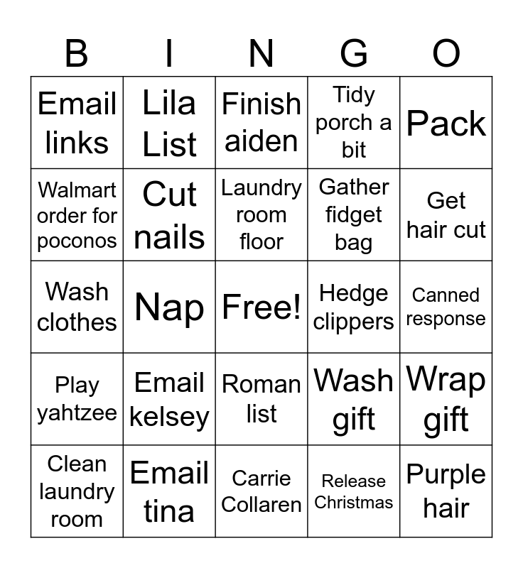 This bingo card has a free space and 24 words: Email kelsey, Email tina, Laundry room floor, Clean laundry room, Pack, Email links, Walmart order for poconos, Lila List, Hedge clippers, Roman list, Gather fidget bag, Wash clothes, Wash gift, Wrap gift, Cut nails, Release Christmas, Canned response, Finish aiden, Get hair cut, Nap, Purple hair, Play yahtzee, Tidy porch a bit and Carrie Collaren.