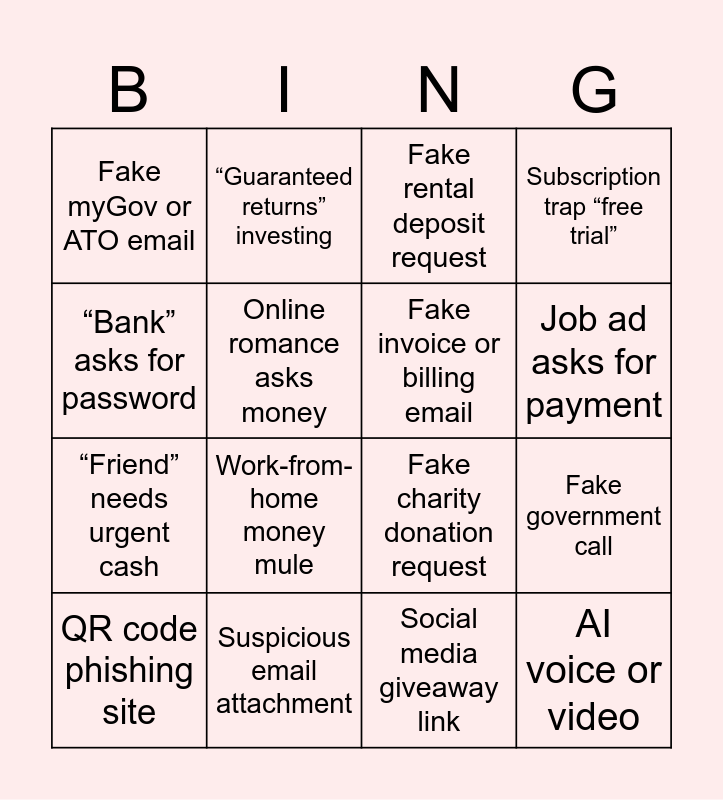 This bingo card has 24 words: Fake parcel text link, “Pay fee to claim prize”, Job ad asks for payment, Fake buyer on Marketplace, “Bank” asks for password, Fake myGov or ATO email, Online romance asks money, “Guaranteed returns” investing, Suspicious email attachment, Tech support remote access, “Friend” needs urgent cash, Fake charity donation request, Third-party bank transfer, Crypto investment scam, Fake invoice or billing email, SMS with weird URL, Social media giveaway link, Fake rental deposit request, Work-from-home money mule, Fake government call, QR code phishing site, AI voice or video, Subscription trap “free trial” and Fake delivery tracking page.