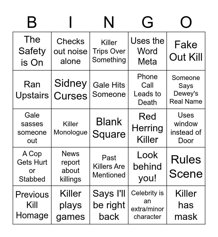This bingo card has a free space and 36 words: Garage door kill, Killer cleans his knife, A Thought Dead Character is Still Alive, Sidney Curses, Look behind you!, A Cop Gets Hurt or Stabbed, Gale Hits Someone, Party Scene, Fake Out Kill, Jump Scare, Killer Monologue, Uses the Word Meta, Killer Calls Somebody, Red Herring Killer, Someone Says Dewey's Real Name, The Safety is On, Judy's Lemon Squares, News report about killings, Killer has mask, Killer Trips Over Something, Uses window instead of Door, Rules Scene, Killer plays games, Previous Kill Homage, Says I'll be right back, Checks out noise alone, Gale sasses someone out, Internal organs, Phone Call Leads to Death, Ran Upstairs, Love Interest/Best Friend is Killer, Killer attacks fornicators, Celebrity is an extra/minor character, Past Killers Are Mentioned, Split up to investigate and Car won't start.