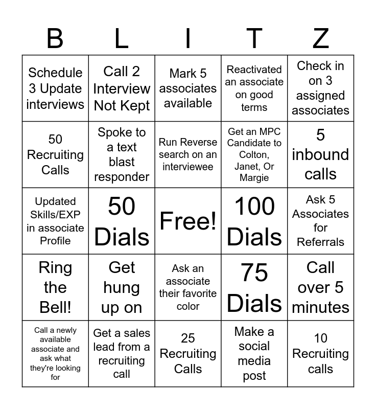 This bingo card has a free space and 24 words: Call a newly available associate and ask what they're looking for, Get hung up on, Run Reverse search on an interviewee, Make a social media post, Check in on 3 assigned associates, Schedule 3 Update interviews, Call 2 Interview Not Kept, Mark 5 associates available, 100 Dials, Ask 5 Associates for Referrals, Updated Skills/EXP in associate Profile, Spoke to a text blast responder, 75 Dials, Call over 5 minutes, 50 Recruiting Calls, Get a sales lead from a recruiting call, 25 Recruiting Calls, Reactivated an associate on good terms, 5 inbound calls, Ring the Bell!, 50 Dials, Ask an associate their favorite color, Get an MPC Candidate to Colton, Janet, Or Margie and 10 Recruiting calls.