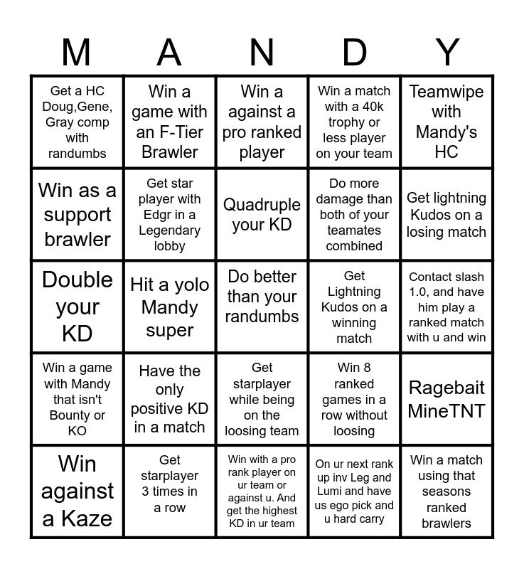 This bingo card has a free space and 24 words: Have the only positive KD in a match, Get starplayer 3 times in a row, Quadruple your KD, Win against a Kaze, Teamwipe with Mandy's HC, Get a HC Doug,Gene, Gray comp with randumbs, Win as a support brawler, Win a game with an F-Tier Brawler, Get Lightning Kudos on a winning match, Get starplayer while being on the loosing team, Do more damage than both of your teamates combined, Double your KD, Win 8 ranked games in a row without loosing, Ragebait MineTNT, Get star player with Edgr in a Legendary lobby, On ur next rank up inv Leg and Lumi and have us ego pick and u hard carry, Contact slash 1.0, and have him play a ranked match with u and win, Win a against a pro ranked player, Get lightning Kudos on a losing match, Hit a yolo Mandy super, Win a match using that seasons ranked brawlers, Win a game with Mandy that isn't Bounty or KO, Win a match with a 40k trophy or less player on your team and Win with a pro rank player on ur team or against u. And get the highest KD in ur team.