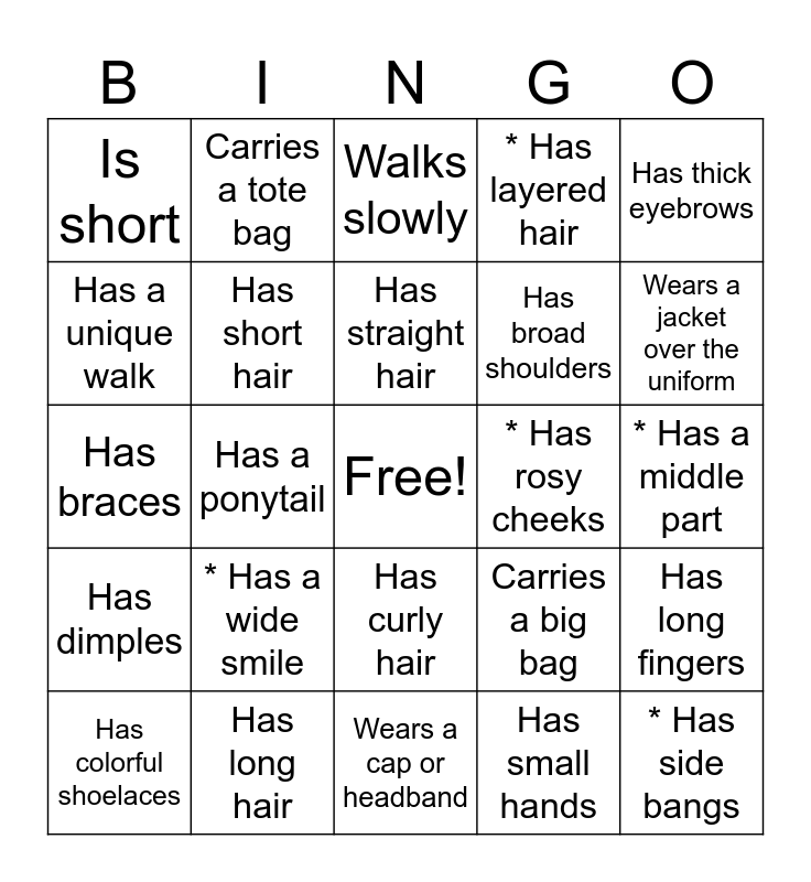 This bingo card has a free space and 40 words: Wears glasses, Has braces, Has bangs, Has short hair, Has long hair, Has curly hair, Has straight hair, Has dyed hair, Has thick eyebrows, Has dimples, Has a ponytail, * Has layered hair, * Has side bangs, * Has a middle part, * Has rosy cheeks, * Has a wide smile, Is tall, Is short, Walks fast, Walks slowly, Has long fingers, Has small hands, Has broad shoulders, Has a unique walk, Has long legs, Has short legs, Walks with a bounce, Has a sporty build, Wears a watch, Wears earrings, Wears a bracelet or necklace, Has colorful shoelaces, Wears mismatched socks, Carries a big bag, Wears a jacket over the uniform, Wears a cap or headband, Has pins or keychains on their bag, * Has pins on their lanyard, Carries a tote bag and Wears oversized clothes.