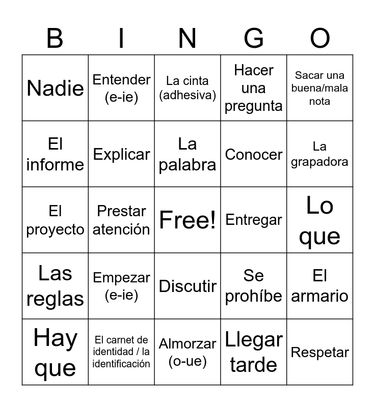 This bingo card has a free space and 35 words: Aprender de memoria, Contestar, Dar un discurso, Explicar, Discutir, Hacer una pregunta, El informe, El labatorio, La palabra, Pedir ayuda, El proyecto, Sacar una buena/mala nota, A tiempo, Algunos/as, Nadie, Entregar, Llegar tarde, Prestar atención, Las reglas, Respetar, Se prohíbe, Hay que, El armario, El carnet de identidad / la identificación, La cinta (adhesiva), La grapadora, Los materiales, Las tijeras, Conocer, Lo que, Sobre, Almorzar (o-ue), Empezar (e-ie), Entender (e-ie) and Repetir (e-i).