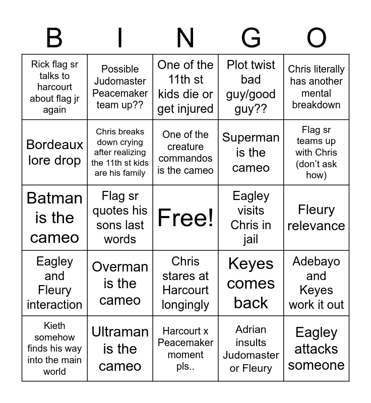 This bingo card has a free space and 24 words: Overman is the cameo, Ultraman is the cameo, One of the creature commandos is the cameo, Kieth somehow finds his way into the main world, Chris literally has another mental breakdown, Rick flag sr talks to harcourt about flag jr again, Bordeaux lore drop, Possible Judomaster Peacemaker team up??, Eagley visits Chris in jail, Chris stares at Harcourt longingly, Superman is the cameo, Batman is the cameo, Keyes comes back, Adebayo and Keyes work it out, Chris breaks down crying after realizing the 11th st kids are his family, Adrian insults Judomaster or Fleury, Fleury relevance, One of the 11th st kids die or get injured, Flag sr teams up with Chris (don’t ask how), Flag sr quotes his sons last words, Eagley attacks someone, Eagley and Fleury interaction, Plot twist bad guy/good guy?? and Harcourt x Peacemaker moment pls...