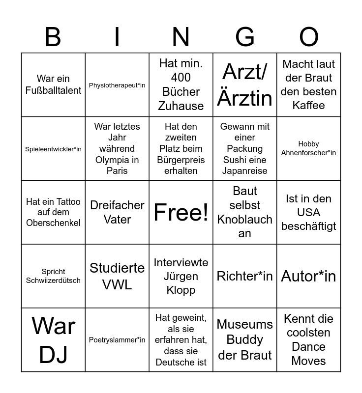 This bingo card has a free space and 72 words: Vierfacher Opa, Physiotherapeut*in, Dreifacher Vater, Jüngste anwesende Person, Konnte als Kind das ABC rülpsen, Innenarchitekt*in, Arzt/Ärztin, War bei Ärzt*innen ohne Grenzen, Gewann mit einer Packung Sushi eine Japanreise, Rettungssanitäter/in, War DJ, Besaß eine Pizzeria, Hobby Ahnenforscher*in, War ein Fußballtalent, Machte das Makeup der Braut, Hat ein Tattoo auf dem Oberschenkel, Richter*in, Macht laut der Braut den besten Kaffee, Studierte in Oxford, Ist in den USA beschäftigt, Studierte VWL, Kennt die coolsten Dance Moves, Autor*in, Ist in einer YouTube Doku zu sehen, War zu Gast in einem YouTube Interview, Schickte sein Boot mit einem Sprung auf reisen, Schwamm dem Boot hinterher, Wurde auf dem Boot zurückgelassen, Hat das neueste IPhone, Segler*in, Poetryslammer*in, Verreist im Winter immer ins Warme, Drag Artist, Konzerte Jäger*in, Museums Buddy der Braut, Studiert BWL, War in Tschernobyl, Dreifacher Opa, Spieleentwickler*in, Wurde zum Bürgerfest im Schloss Bellevue eingeladen, Interviewte Jürgen Klopp, Poledancer*in, Zauberer/Zauberin, Cosplayer*in, Machte das Foto auf der Einladung, Spricht Schwiizerdütsch, Ist Tätowiert, Reiste alleine nach Mallorca, Geht min. 3x die Woche ins Fitti, Hat den kürzesten Weg zum Standesamt, Leitet einen Podcast, Leidenschaftliche/r Secondhand Shopper*in, Reiste kurz vor der Geburt seines Kindes nach Japan, Baut selbst Knoblauch an, Wurde von Nintendo eingeladen die Switch2 vorzeitig zu bestellen, Hat zu Gast in einer Studierendenverbindung gelebt, Hat min. 400 Bücher Zuhause, Hat den zweiten Platz beim Bürgerpreis erhalten, Hat ihren Hochzeitstag am Geburtstag ihres Bruders, Will KI fairer machen, Fing mit 16 an zu studieren, Ist Shadow Run Game Master (D&D), Trinkt täglich Kakao, Hat geweint, als sie erfahren hat, dass sie Deutsche ist, War im Freiwilligen Wehrdienst, Fährt ausschließlich mit dem Zug in den Urlaub, War letztes Jahr während Olympia in Paris, Hat in einer Band gespielt, Hat in einem Orchester gespielt, Hat an Weihnachten Geburtstag, Hat eine Insta Page mit Stick Projekten and Benutzt einen Föhn um seinen Körper zu trocknen.