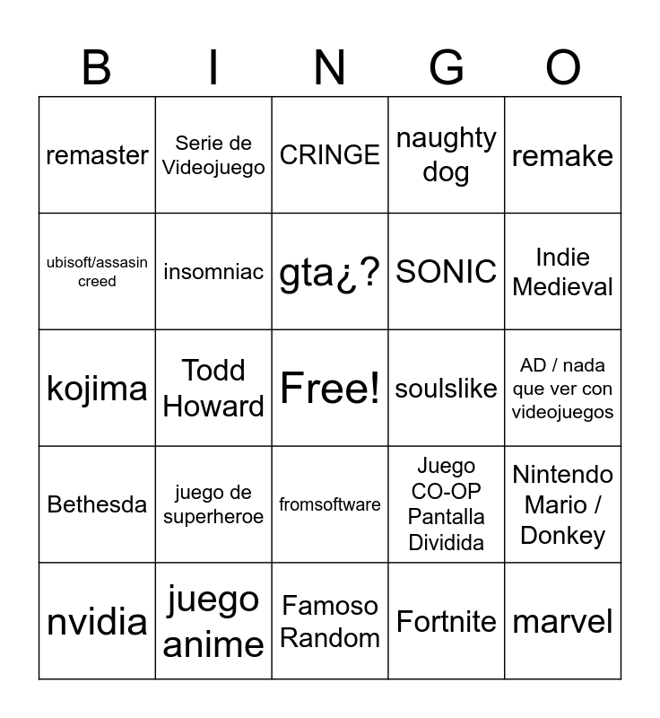 This bingo card has a free space and 24 words: juego de superheroe, juego anime, gta¿?, nvidia, remake, remaster, ubisoft/assasin creed, Serie de Videojuego, soulslike, fromsoftware, SONIC, kojima, Juego CO-OP Pantalla Dividida, Nintendo Mario / Donkey, insomniac, Fortnite, AD / nada que ver con videojuegos, CRINGE, Indie Medieval, Todd Howard, marvel, Bethesda, naughty dog and Famoso Random.
