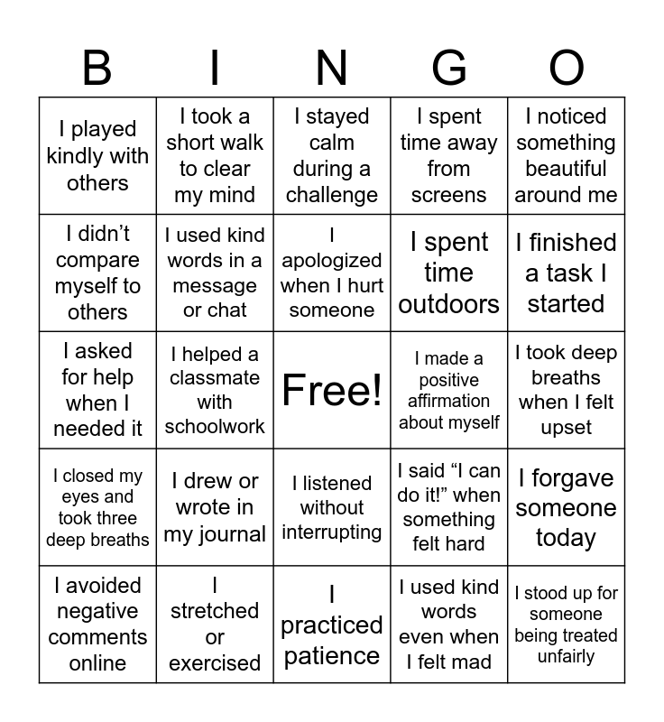 This bingo card has a free space and 100 words: I named how I felt today, I shared my feelings with someone I trust, I took deep breaths when I felt upset, I drew how I was feeling, I noticed when I started to feel sad or angry, I helped a friend who was having a bad day, I said something kind to myself, I took a break when I felt stressed, I practiced calm breathing for one minute, I smiled at myself in the mirror, I ate a healthy snack or meal, I drank enough water today, I got a good night’s sleep, I stretched or exercised, I brushed my teeth and washed my face, I kept my things clean and organized, I spent time outdoors, I listened to relaxing music, I took time to rest when I felt tired, I used my favorite way to calm down (e.g., coloring, reading, hugging a pillow), I said “thank you” to someone today, I wrote or thought of three things I’m grateful for, I focused on something good that happened, I complimented a classmate or family member, I smiled at someone today, I made a positive affirmation about myself, I noticed something beautiful around me, I said “I can do it!” when something felt hard, I made someone else smile, I reminded myself that mistakes help me learn, I helped a classmate with schoolwork, I played kindly with others, I listened carefully when someone was talking, I invited someone to join a game, I used kind words even when I felt mad, I apologized when I hurt someone, I forgave someone today, I shared my things, I gave someone a compliment, I showed respect to a teacher or parent, I tried something new, I didn’t give up even when something was difficult, I asked for help when I needed it, I learned from a mistake, I finished a task I started, I stayed calm during a challenge, I celebrated a small success, I said, “I’ll try again!”, I believed in myself, I practiced patience, I did a few minutes of quiet time, I noticed my breathing, I focused on one thing at a time, I practiced mindfulness (listened carefully, looked around, or smelled something nice), I colored or doodled calmly, I watched the clouds or nature, I did something creative to relax, I listened to the sounds around me, I slowed down when I felt rushed, I spent time away from screens, I helped with chores at home, I said “I love you” to a family member, I hugged a loved one, I shared what happened at school with my family, I helped cook or set the table, I thanked my parents or guardians, I played a board game or activity with family, I made a card or note for someone I love, I listened when a family member talked, I said “good morning” or “good night” kindly, I read a book for fun, I drew or wrote in my journal, I did something I’m proud of, I spent time on a favorite hobby, I laughed today, I thought of a new way to solve a problem, I told myself, “It’s okay to make mistakes”, I didn’t compare myself to others, I stayed calm when plans changed, I tried again after failing the first time, I noticed when someone needed help, I stood up for someone being treated unfairly, I shared encouraging words with a friend, I listened without interrupting, I showed care to an animal or pet, I took a short walk to clear my mind, I counted slowly from 1 to 10 to calm down, I practiced sitting quietly for one minute, I looked for things I could see, hear, and feel to stay grounded, I closed my eyes and took three deep breaths, I took a break from gadgets or social media, I used technology for learning, not arguing or comparing, I watched something that made me feel happy, I avoided negative comments online, I used kind words in a message or chat, I reminded myself that I am unique, I said something I like about myself, I stood tall and walked with confidence, I practiced saying “no” when I needed to and I believed that tomorrow can be a better day.
