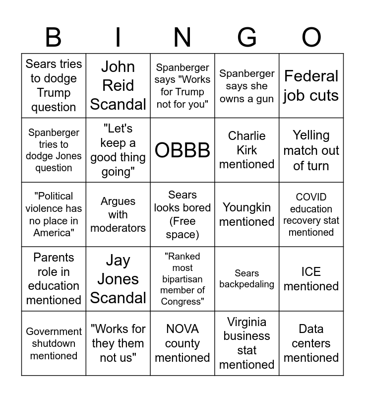 This bingo card has a free space and 24 words: Jay Jones Scandal, "Works for they them not us", OBBB, Government shutdown mentioned, Federal job cuts, Sears tries to dodge Trump question, Spanberger tries to dodge Jones question, John Reid Scandal, Youngkin mentioned, "Ranked most bipartisan member of Congress", Charlie Kirk mentioned, "Political violence has no place in America", Sears backpedaling, ICE mentioned, "Let's keep a good thing going", Virginia business stat mentioned, COVID education recovery stat mentioned, Spanberger says "Works for Trump not for you", Yelling match out of turn, Argues with moderators, Data centers mentioned, Parents role in education mentioned, Spanberger says she owns a gun and NOVA county mentioned.