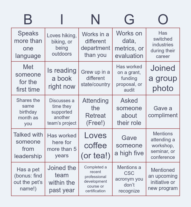 This bingo card has a free space and 24 words: Has worked here for more than 5 years, Joined the team within the past year, Grew up in a different state/country, Has a pet (bonus: find out the pet’s name!), Has switched industries during their career, Speaks more than one language, Met someone for the first time, Loves hiking, biking, or being outdoors, Asked someone about their role, Loves coffee (or tea!), Has worked on a grant, funding proposal, or audit, Shares the same birthday month as you, Gave someone a high five, Mentions attending a workshop, seminar, or conference, Is reading a book right now, Mentions a CSC acronym you don’t recognize, Gave a compliment, Works in a different department than you, Joined a group photo, Discusses a time they supported another team’s project, Mentioned an upcoming initiative or new program, Talked with someone from leadership, Works on data, metrics, or evaluation and Completed a recent professional development course or certification.