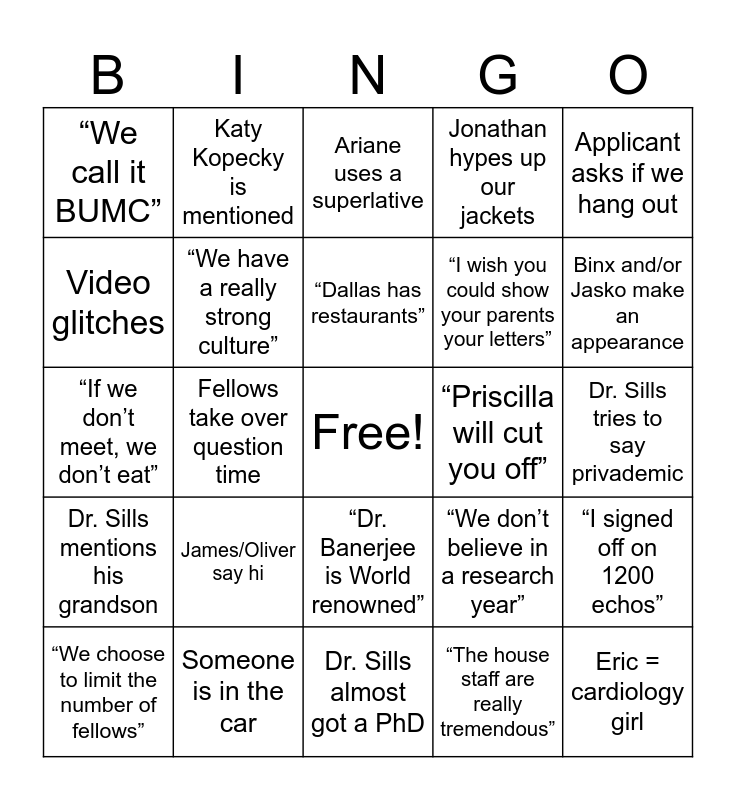 This bingo card has a free space and 53 words: “Call isn’t that bad”, Eric = cardiology girl, “Dallas is growing really fast”, “The house staff are really tremendous”, James/Oliver say hi, Awkward silence, Katy Kopecky is mentioned, Someone talks while muted, Video glitches, Awkward silence, “We have a really strong culture”, “They used to call it Parkland”, “I signed off on 1200 echos”, “We don’t believe in a research year”, Someone’s video freezes while driving, “We choose to limit the number of fellows”, “Dallas has restaurants”, “Priscilla will cut you off”, Ariane is outside, Applicant asks if we hang out, Fellows take over question time, The Lemieuxs are not related, “I wish you could show your parents your letters”, “We call it BUMC”, Someone forgets they’re unmuted, Someone is in the car, Grayson makes an appearance, We received 800-900 applications, Someone tells a dad joke, Binx and/or Jasko make an appearance, A dog makes an appearance, Adam does fitness, Someone gets put in the wrong interview room, We own imaging, Eric says Ecpella, Jonathan talks about sports, Jonathan hypes up our jackets, Dr. Sills almost got a PhD, Ariane uses a superlative, We are the major center for A&M medical school, The kardashians are mentioned, “EP makes fun of me because I can’t read an EKG right”, Dr. Sills tries to say privademic, “Jeffrey”, “Dr. Gong is californiaing our Texas”, “Dr. Banerjee is World renowned”, Nicole laughs at the group chat on camera, “I will pick on your hobbies”, “If we don’t meet, we don’t eat”, Dr. Sills mentions his grandson, Someone says “do do”, Schuss is pluripotent and Nymeria or Earl makes an appearance.