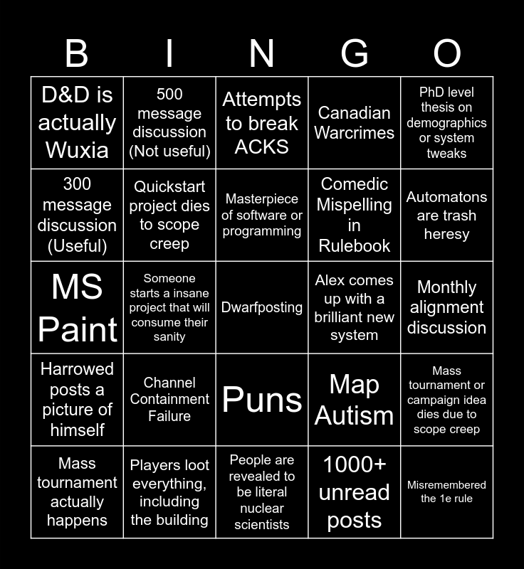 This bingo card has a free space and 24 words: Channel Containment Failure, Players loot everything, including the building, Masterpiece of software or programming, Mass tournament actually happens, PhD level thesis on demographics or system tweaks, D&D is actually Wuxia, 300 message discussion (Useful), 500 message discussion (Not useful), Alex comes up with a brilliant new system, Puns, Comedic Mispelling in Rulebook, MS Paint, Map Autism, Mass tournament or campaign idea dies due to scope creep, Quickstart project dies to scope creep, 1000+ unread posts, Monthly alignment discussion, Attempts to break ACKS, Automatons are trash heresy, Someone starts a insane project that will consume their sanity, Misremembered the 1e rule, Harrowed posts a picture of himself, Canadian Warcrimes and People are revealed to be literal nuclear scientists.