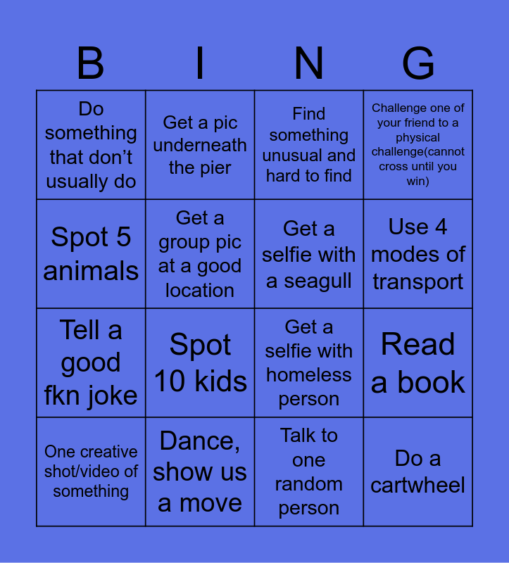 This bingo card has 16 words: Dance, show us a move, Read a book, Find something unusual and hard to find, Do something that don’t usually do, Tell a good fkn joke, Get a pic underneath the pier, Get a selfie with homeless person, Talk to one random person, Spot 5 animals, Get a group pic at a good location, One creative shot/video of something, Challenge one of your friend to a physical challenge(cannot cross until you win), Spot 10 kids, Use 4 modes of transport, Get a selfie with a seagull and Do a cartwheel.