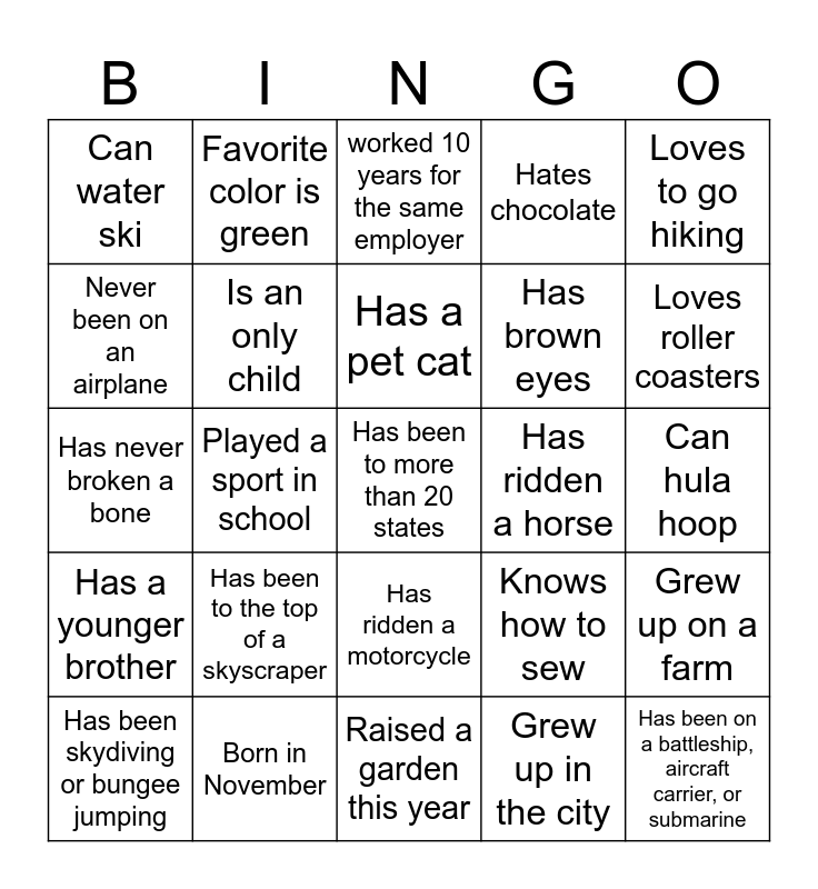 This bingo card has 40 words: Is left handed, Has never broken a bone, Born in February, Is an only child, Born in November, Has ridden a motorcycle, Has a pet cat, Has an older sister, Loves to go hiking, Has a younger brother, Played a sport in school, Hates chocolate, Has been to more than 20 states, Can hula hoop, Has ridden a horse, Has been to the top of a skyscraper, Had an imaginary friend as a child, Can water ski, Can juggle, worked 10 years for the same employer, Grew up on a farm, Grew up in the city, Has brown eyes, Never been on an airplane, Has met a celebrity, Has a pet dog, Has run a marathon, Has been to 10 national parks, Has been on a battleship, aircraft carrier, or submarine, Swam with dolphins or sharks, Has won a championship, Has been skydiving or bungee jumping, Likes to fish, Knows how to sew, Loves roller coasters, Raised a garden this year, Has had stitches, likes spicy food, Favorite color is green and Can whistle.