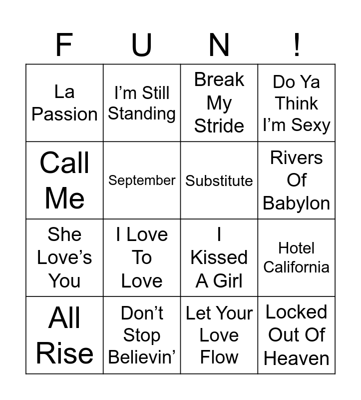 This bingo card has 44 words: 9 PM Till I Come, All Rise, Angels, Another Brick In The Wall, Betty Davis Eyes, Blinding Lights, Break My Stride, Brown Eyed Girl, Call Me, Chain Reaction, Do Ya Think I’m Sexy, Don’t Stop Believin’, Flashdance, Frankie, Gangsta’s Paradise, Grace Kelly, Hold On, I Kissed A Girl, I Love Rock n Roll, I Love To Love, I’m Still Standing, Insomnia, It’s Raining Men, La Passion, Left Outside Alone, Let Your Love Flow, Levitating, Like A Virgin, Livin’ La Vida Loca, Locked Out Of Heaven, Love Is All Around, Mississippi, My Way, Poker Face, Hotel California, Red Red Wine, Rhythm Is A Dancer, Rhythm Of The Night, Rivers Of Babylon, September, She Love’s You, Show Me Love, Substitute and Superstar.