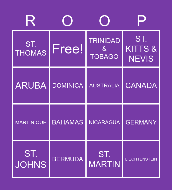 This bingo card has 33 words: ENGLAND, HOLLAND, GERMANY, FRANCE, LIECHTENSTEIN, AUSTRALIA, ARUBA, NEW ZEALAND, Free!, GREENLAND, CANADA, TRINIDAD & TOBAGO, SURINAME, BARBADOS, BERMUDA, BAHAMAS, PANAMA, NICARAGUA, JAMAICA, COLOMBIA, COSTA RICA, CURACAO, ST. THOMAS, ST. MARTIN, ST. LUCIA, ST. JOHNS, ST. KITTS & NEVIS, MARTINIQUE, DOMINICA, MEXICO, GRAND CAYMAN, DOMINICAN REPUBLIC and GUATEMALA.