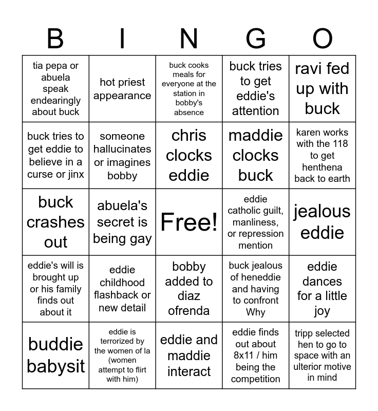 This bingo card has a free space and 24 words: eddie childhood flashback or new detail, eddie is terrorized by the women of la (women attempt to flirt with him), chris clocks eddie, buddie babysit, ravi fed up with buck, tia pepa or abuela speak endearingly about buck, buck tries to get eddie to believe in a curse or jinx, hot priest appearance, eddie catholic guilt, manliness, or repression mention, bobby added to diaz ofrenda, maddie clocks buck, buck crashes out, buck jealous of heneddie and having to confront Why, eddie dances for a little joy, someone hallucinates or imagines bobby, eddie finds out about 8x11 / him being the competition, jealous eddie, buck cooks meals for everyone at the station in bobby's absence, karen works with the 118 to get henthena back to earth, abuela's secret is being gay, tripp selected hen to go to space with an ulterior motive in mind, eddie's will is brought up or his family finds out about it, buck tries to get eddie's attention and eddie and maddie interact.