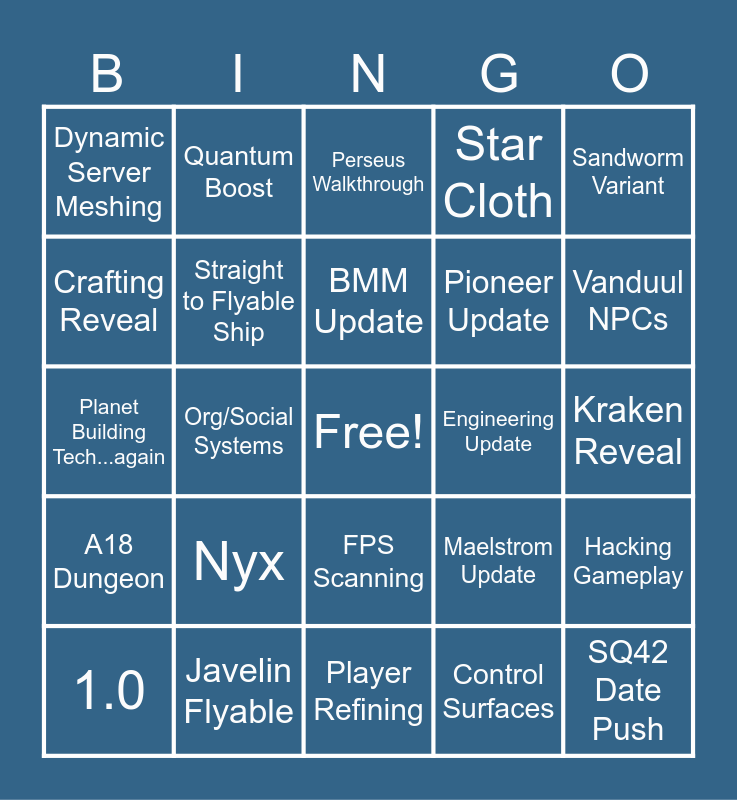 This bingo card has a free space and 24 words: Nyx, Javelin Flyable, BMM Update, 1.0, Sandworm Variant, Dynamic Server Meshing, Crafting Reveal, Quantum Boost, Engineering Update, FPS Scanning, Pioneer Update, Planet Building Tech...again, Maelstrom Update, Hacking Gameplay, Straight to Flyable Ship, Control Surfaces, Kraken Reveal, Perseus Walkthrough, Vanduul NPCs, Org/Social Systems, SQ42 Date Push, A18 Dungeon, Star Cloth and Player Refining.