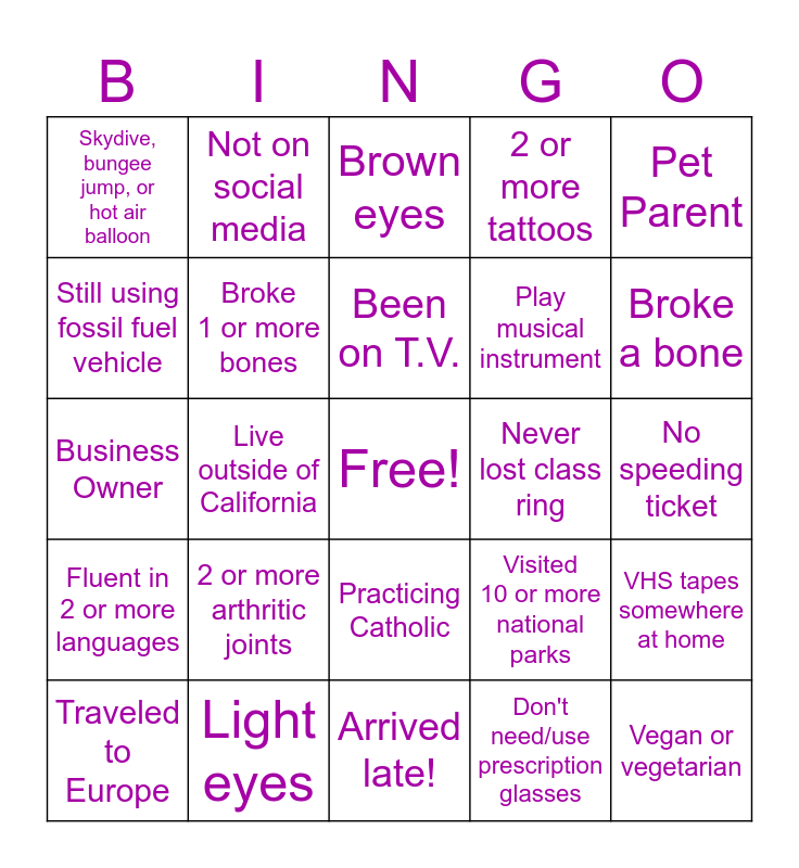 This bingo card has a free space and 24 words: Traveled to Europe, 2 or more arthritic joints, Been on T.V., Don't need/use prescription glasses, Pet Parent, Skydive, bungee jump, or hot air balloon, Not on social media, Brown eyes, Never lost class ring, No speeding ticket, Business Owner, Broke 1 or more bones, Visited 10 or more national parks, VHS tapes somewhere at home, Still using fossil fuel vehicle, Light eyes, Arrived late!, 2 or more tattoos, Broke a bone, Fluent in 2 or more languages, Live outside of California, Practicing Catholic, Play musical instrument and Vegan or vegetarian.