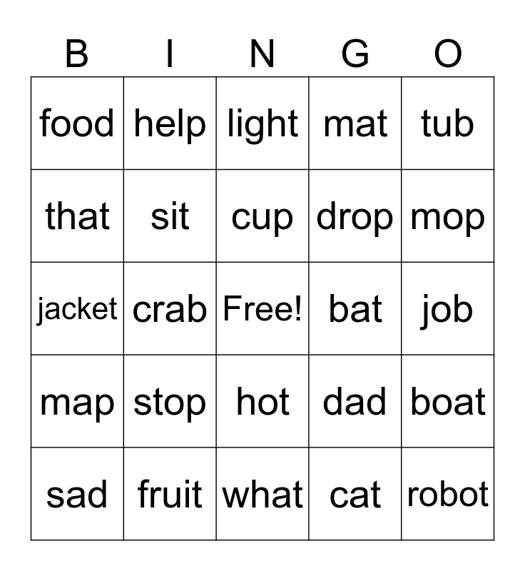This bingo card has a free space and 24 words: stop, fruit, cup, sad, tub, food, that, help, bat, hot, drop, jacket, dad, boat, sit, cat, job, light, mop, crab, robot, map, mat and what.