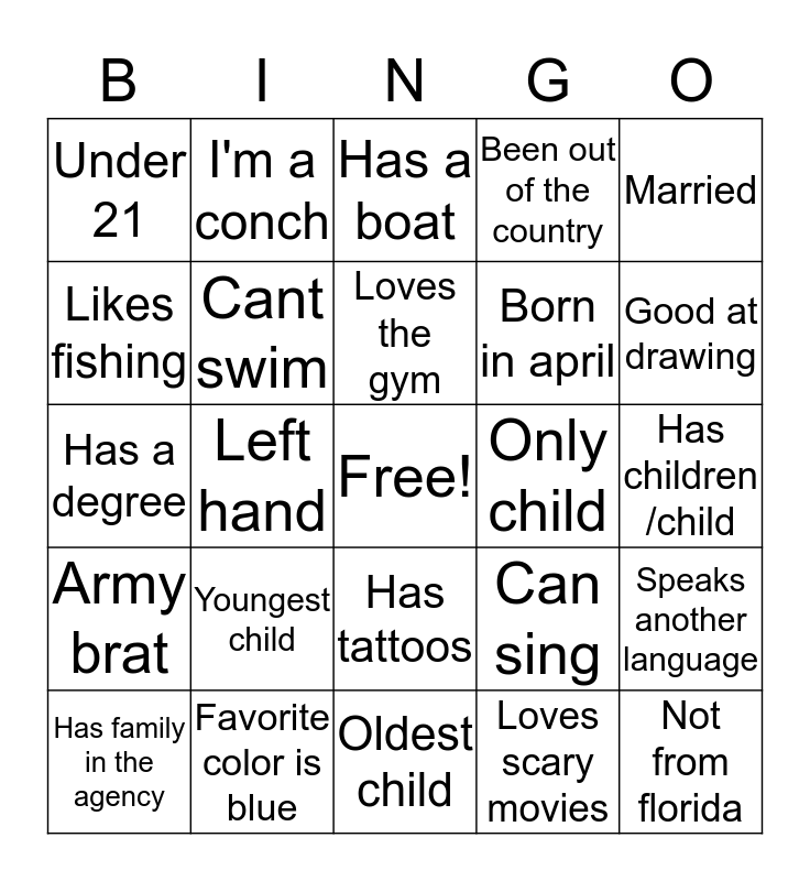 This bingo card has a free space and 24 words: Youngest child, Favorite color is blue, Loves the gym, Has family in the agency, Married, Under 21, Likes fishing, I'm a conch, Only child, Has tattoos, Born in april, Has a degree, Can sing, Speaks another language, Cant swim, Loves scary movies, Has children /child, Has a boat, Good at drawing, Left hand, Not from florida, Army brat, Been out of the country and Oldest child.
