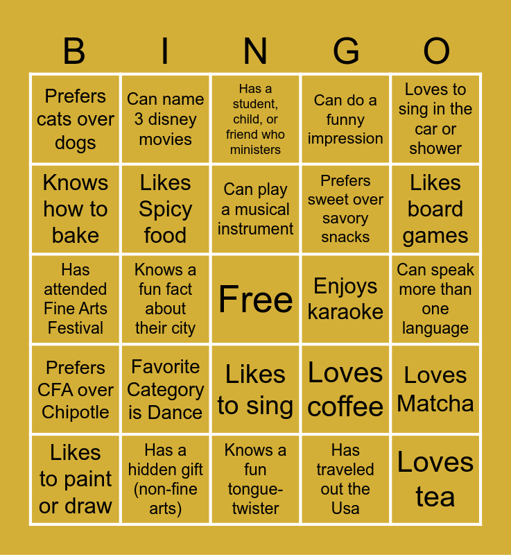 This bingo card has a free space and 24 words: Favorite Category is Dance, Has a hidden gift (non-fine arts), Can play a musical instrument, Likes to paint or draw, Loves to sing in the car or shower, Prefers cats over dogs, Knows how to bake, Can name 3 disney movies, Enjoys karaoke, Likes to sing, Prefers sweet over savory snacks, Has attended Fine Arts Festival, Loves coffee, Loves Matcha, Likes Spicy food, Has traveled out the Usa, Can speak more than one language, Has a student, child, or friend who ministers, Likes board games, Knows a fun fact about their city, Loves tea, Prefers CFA over Chipotle, Can do a funny impression and Knows a fun tongue-twister.