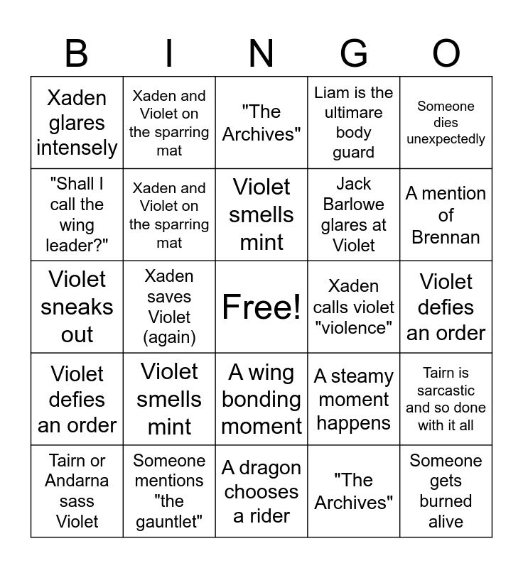 This bingo card has a free space and 29 words: Tairn or Andarna sass Violet, Violet climbs something she shouldn't, Xaden saves Violet (again), A wing bonding moment, Xaden glares intensely, "The Archives", Xaden and Violet on the sparring mat, Violet smells mint, Xaden calls violet "violence", Someone mentions "the gauntlet", Violet defies an order, Someone gets burned alive, A dragon chooses a rider, "The Archives", A mention of Brennan, Someone tells Violet she's going to die, A wing bonding moment, Violet defies an order, Someone dies unexpectedly, Violet sneaks out, A steamy moment happens, Violet sneaks out, Jack Barlowe glares at Violet, "Shall I call the wing leader?", Liam is the ultimare body guard, Xaden and Violet on the sparring mat, Tairn is sarcastic and so done with it all, Violet smells mint and Xaden calls Violet "Violence".