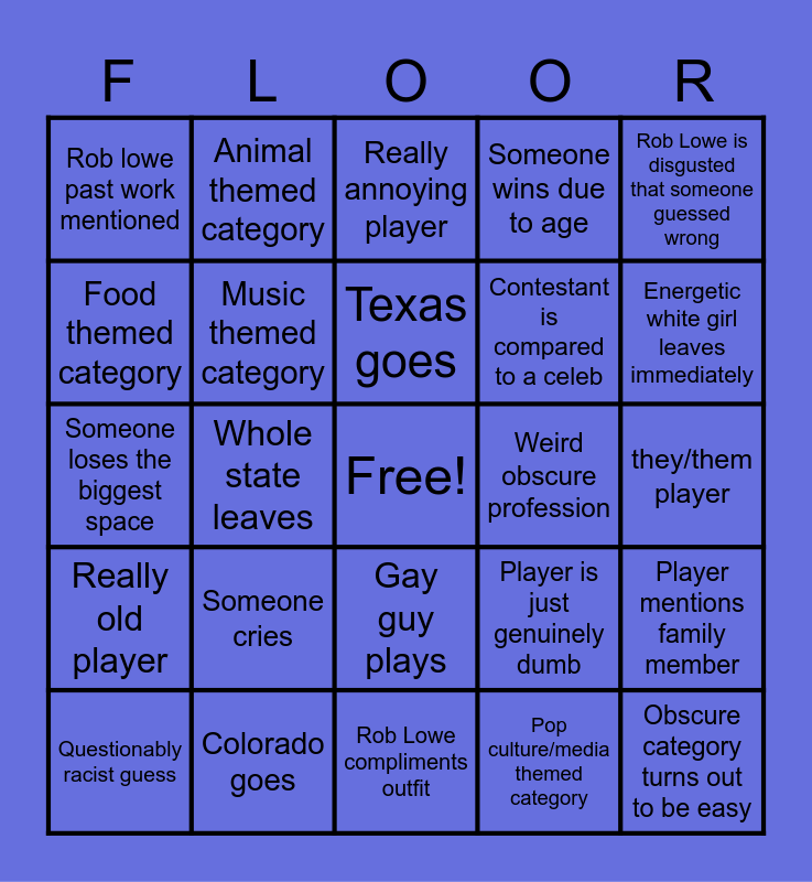 This bingo card has a free space and 24 words: Someone cries, Colorado goes, Texas goes, Questionably racist guess, Rob Lowe is disgusted that someone guessed wrong, Rob lowe past work mentioned, Food themed category, Animal themed category, Weird obscure profession, Gay guy plays, Contestant is compared to a celeb, Someone loses the biggest space, Player is just genuinely dumb, Player mentions family member, Music themed category, Pop culture/media themed category, they/them player, Really annoying player, Energetic white girl leaves immediately, Whole state leaves, Obscure category turns out to be easy, Really old player, Someone wins due to age and Rob Lowe compliments outfit.