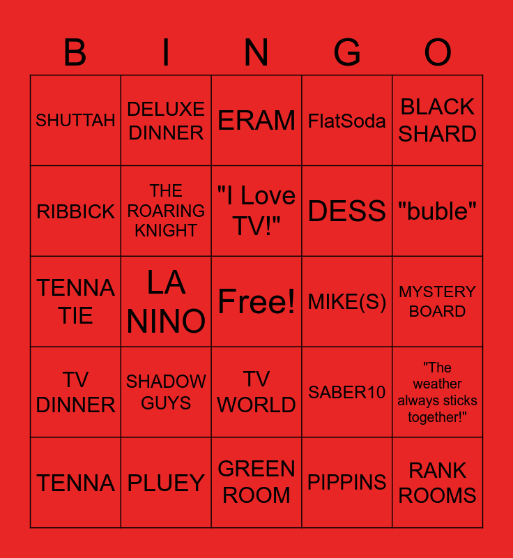 This bingo card has a free space and 29 words: TENNA, RAMB, LA NINO, EL NINA, SHUTTAH, ERAM, THE ROARING KNIGHT, SHADOW GUYS, MIKE(S), PLUEY, MYSTERY BOARD, RANK ROOMS, GREEN ROOM, PIPPINS, "buble", "WOAH MAMA HOW WHAT THE MAMA WOAH WHAT", TV WORLD, TV DINNER, BLACK SHARD, TENNA TIE, SABER10, "I haveth a laser pointere", DESS, RIBBICK, FlatSoda, DELUXE DINNER, "The weather always sticks together!", "I Love TV!" and Tropic of Love.