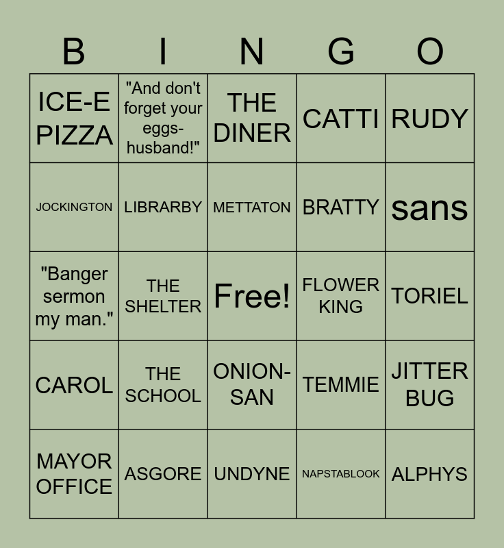 This bingo card has a free space and 29 words: MAYOR OFFICE, THE CHURCH, THE SHELTER, THE GRAVEYARD, ICE-E PIZZA, THE DINER, LIBRARBY, THE SCHOOL, FLOWER KING, ASGORE, TORIEL, ALPHYS, UNDYNE, NAPSTABLOOK, sans, Fruit Juice., ONION-SAN, CAROL, RUDY, "Banger sermon my man.", TEMMIE, CATTY, BRATTY, JOCKINGTON, CATTI, "And don't forget your eggs-husband!", JITTER BUG, METTATON and egg..