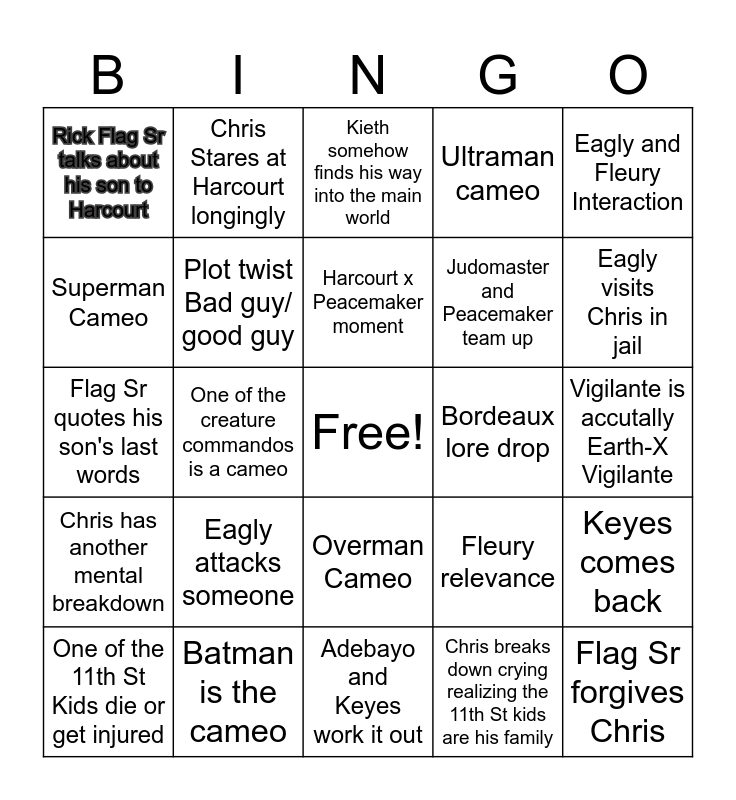 This bingo card has a free space and 24 words: Eagly attacks someone, Batman is the cameo, Harcourt x Peacemaker moment, One of the 11th St Kids die or get injured, Eagly and Fleury Interaction, Rick Flag Sr talks about his son to Harcourt, Superman Cameo, Chris Stares at Harcourt longingly, Bordeaux lore drop, Overman Cameo, Judomaster and Peacemaker team up, Flag Sr quotes his son's last words, Fleury relevance, Keyes comes back, Plot twist Bad guy/ good guy, Chris breaks down crying realizing the 11th St kids are his family, Vigilante is accutally Earth-X Vigilante, Kieth somehow finds his way into the main world, Eagly visits Chris in jail, One of the creature commandos is a cameo, Flag Sr forgives Chris, Chris has another mental breakdown, Ultraman cameo and Adebayo and Keyes work it out.