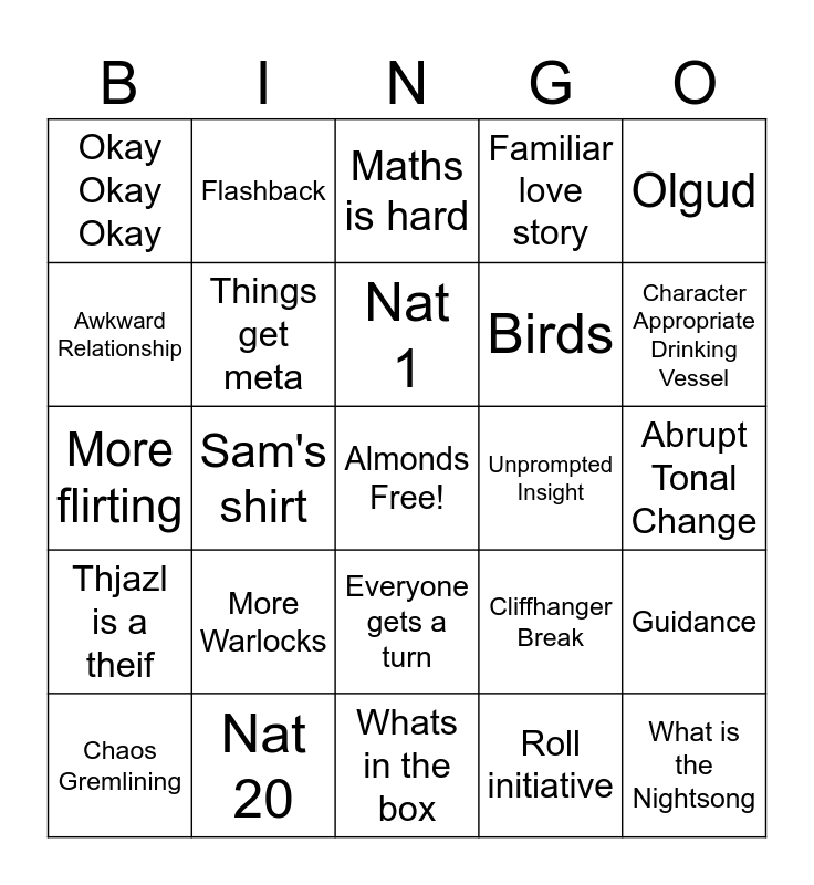 This bingo card has a free space and 24 words: More Warlocks, Nat 20, Nat 1, Chaos Gremlining, Olgud, Okay Okay Okay, Awkward Relationship, Flashback, Unprompted Insight, Everyone gets a turn, Birds, More flirting, Cliffhanger Break, Guidance, Things get meta, Roll initiative, Abrupt Tonal Change, Maths is hard, Character Appropriate Drinking Vessel, Sam's shirt, What is the Nightsong, Thjazl is a theif, Familiar love story and Whats in the box.