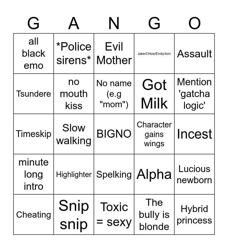 This bingo card has a free space and 24 words: Highlighter, Snip snip, No name (e.g "mom"), Cheating, Assault, all black emo, Tsundere, *Police sirens*, Character gains wings, Spelking, Got Milk, Timeskip, Alpha, Lucious newborn, no mouth kiss, The bully is blonde, Incest, Evil Mother, Mention 'gatcha logic', Slow walking, Hybrid princess, minute long intro, Jake/Chloe/Emily/tom and Toxic = sexy.