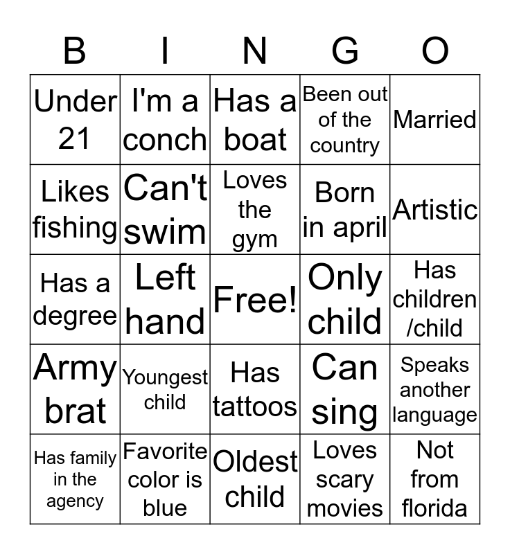 This bingo card has a free space and 24 words: Youngest child, Favorite color is blue, Loves the gym, Has family in the agency, Married, Under 21, Likes fishing, I'm a conch, Only child, Has tattoos, Born in april, Has a degree, Can sing, Speaks another language, Can't swim, Loves scary movies, Has children /child, Has a boat, Artistic, Left hand, Not from florida, Army brat, Been out of the country and Oldest child.