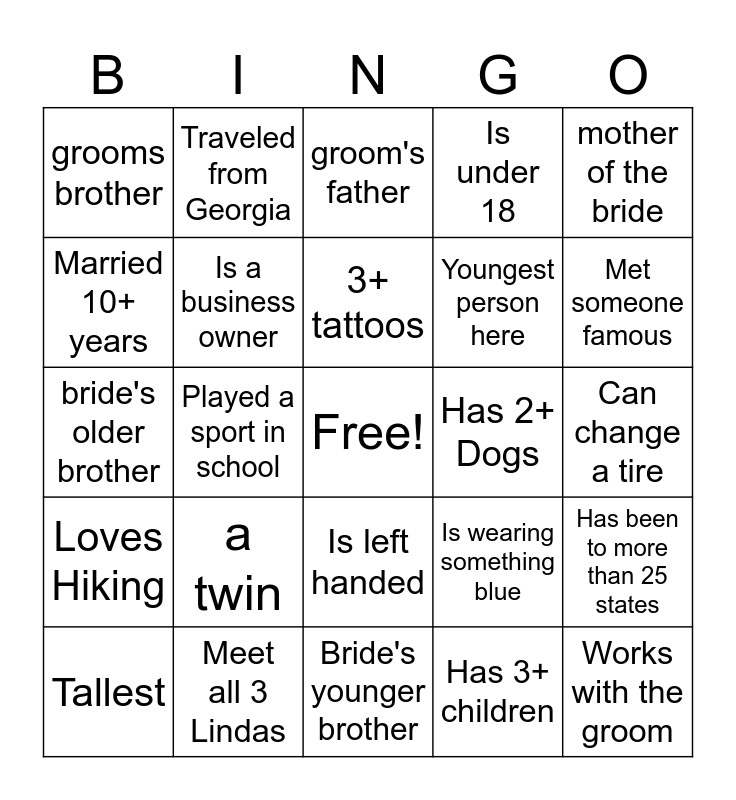 This bingo card has a free space and 24 words: a twin, Meet all 3 Lindas, 3+ tattoos, Tallest, mother of the bride, grooms brother, Married 10+ years, Traveled from Georgia, Has 2+ Dogs, Is left handed, Youngest person here, bride's older brother, Is wearing something blue, Has been to more than 25 states, Is a business owner, Has 3+ children, Can change a tire, groom's father, Met someone famous, Played a sport in school, Works with the groom, Loves Hiking, Is under 18 and Bride's younger brother.