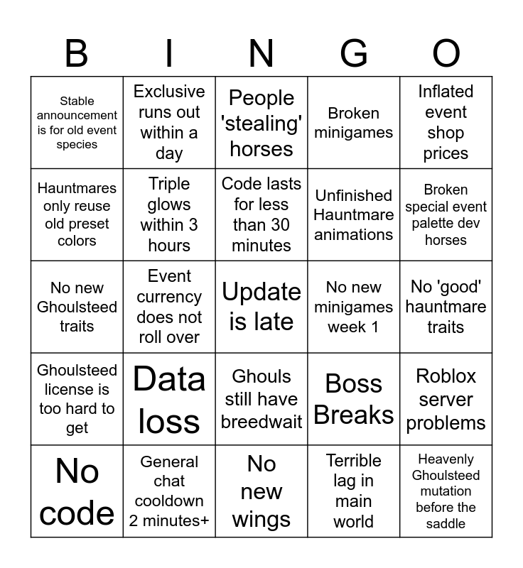 This bingo card has a free space and 24 words: Data loss, General chat cooldown 2 minutes+, Code lasts for less than 30 minutes, No code, Inflated event shop prices, Stable announcement is for old event species, Hauntmares only reuse old preset colors, Exclusive runs out within a day, No new minigames week 1, Ghouls still have breedwait, Unfinished Hauntmare animations, No new Ghoulsteed traits, Boss Breaks, Roblox server problems, Triple glows within 3 hours, Terrible lag in main world, No 'good' hauntmare traits, People 'stealing' horses, Broken special event palette dev horses, Event currency does not roll over, Heavenly Ghoulsteed mutation before the saddle, Ghoulsteed license is too hard to get, Broken minigames and No new wings.