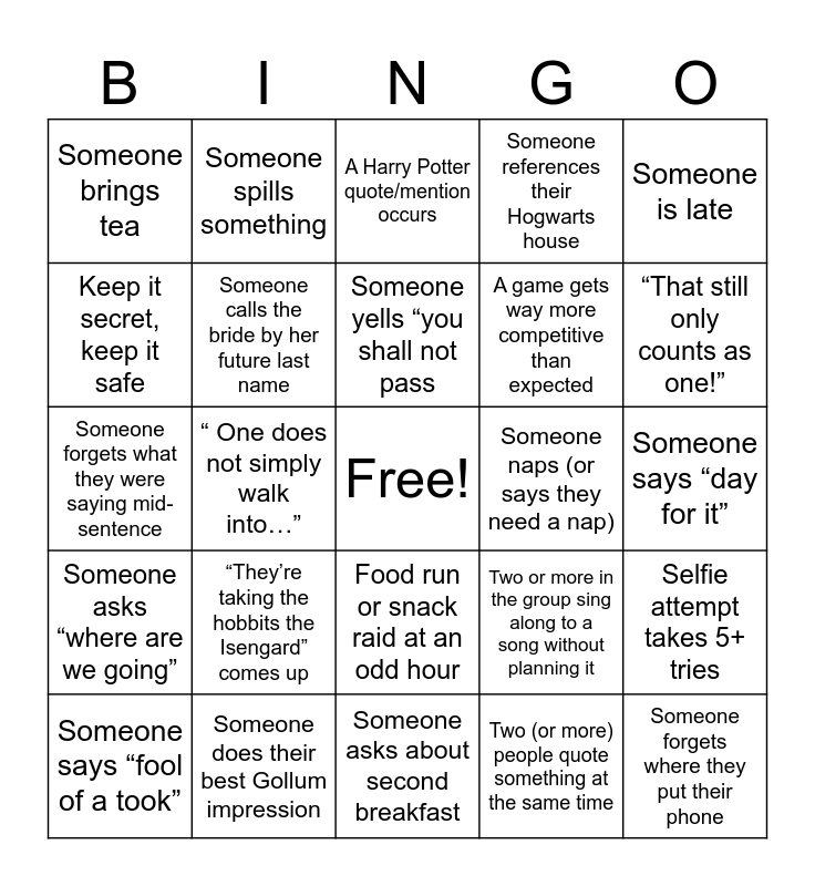 This bingo card has a free space and 25 words: “They’re taking the hobbits the Isengard” comes up, Someone asks about second breakfast, Someone yells “you shall not pass, Someone says “fool of a took”, Someone is late, Someone brings tea, Keep it secret, keep it safe, Someone spills something, Someone naps (or says they need a nap), Food run or snack raid at an odd hour, A game gets way more competitive than expected, Someone forgets what they were saying mid-sentence, Two or more in the group sing along to a song without planning it, Selfie attempt takes 5+ tries, Someone calls the bride by her future last name, Someone makes a pun/joke so bad it’s good, Someone says “day for it”, A Harry Potter quote/mention occurs, “That still only counts as one!”, “ One does not simply walk into…”, Someone forgets where they put their phone, Someone does their best Gollum impression, Someone asks “where are we going”, Someone references their Hogwarts house and Two (or more) people quote something at the same time.