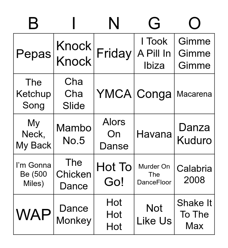 This bingo card has 37 words: Guess, Traag, Suavemente, Cha Cha Slide, Calabria 2008, The Chicken Dance, YMCA, Hips Don’t Lie, Gimme Gimme Gimme, Cotton Eye Joe, Mambo No.5, I Took A Pill In Ibiza, Alors On Danse, Danza Kuduro, The Ketchup Song, I’m Gonna Be (500 Miles), Born Again, Friday, Hot To Go!, Havana, Pepas, Macarena, WAP, Hot Hot Hot, Tubthumping, Not Like Us, Knock Knock, Tusa, September, Tarzan & Jane, Levitating, Dance Monkey, My Neck, My Back, Shake It To The Max, Murder On The DanceFloor, Conga and Pony.