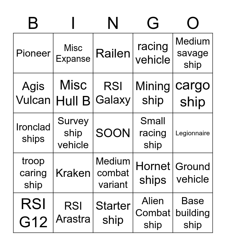 This bingo card has a free space and 24 words: Kraken, RSI Arastra, RSI Galaxy, RSI G12, Medium savage ship, Pioneer, Agis Vulcan, Misc Expanse, Small racing ship, Medium combat variant, Mining ship, Ironclad ships, Hornet ships, Ground vehicle, Misc Hull B, Alien Combat ship, Legionnaire, Railen, cargo ship, Survey ship vehicle, Base building ship, troop caring ship, racing vehicle and Starter ship.