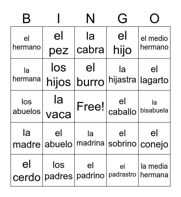 This bingo card has a free space and 59 words: la familia nuclear, los padres, la madrastra, la madre, el padrastro, el padre, los hijos, la hija, la hijastra, el hijastro, el hijo, los hermanos, la hermana, la hermanastra, el hermanastro, el hermano, la media hermana, el medio hermano, la mascota, el burro, el caballo, la cabra, el cerdo, el conejo, el cuy, la gallina, el gato, el hámster, el lagarto, el mapache, la oveja, el pájaro, el pavo real, el perro, el pez, la serpiente, la tortuga, la vaca, la familia extendida, los abuelos, la abuela, el abuelo, la bisabuela, el bisabuelo, los nietos, la nieta, el nieto, los padrinos, la madrina, el padrino, los primos, la prima, el primo, los sobrinos, la sobrina, el sobrino, los tíos, la tía and el tío.